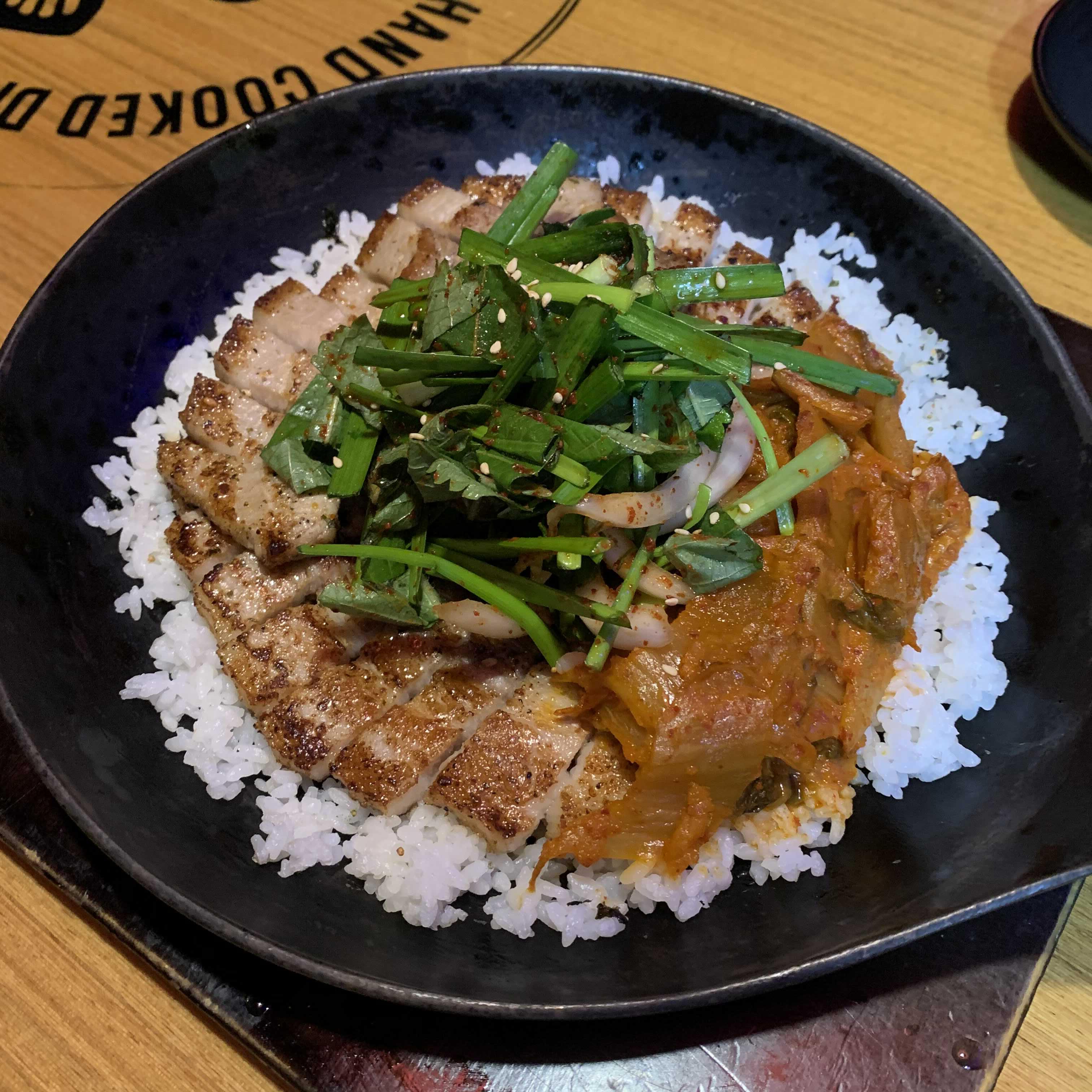 자, 기다리고 기다리던 안주가 나왔습니다. 아랫쪽에 밥을 깔고 삼겹살,볶음김치,부추,양파로 이루어져 있습니다. 삼겹살에 볶음김치와 부추를 곁들여 먹으니 존맛 입니다. 배가 고프신 분들이 시켜도 밥과 삼겹살이 있어 상당히 배가 채워질 안주 입니다.