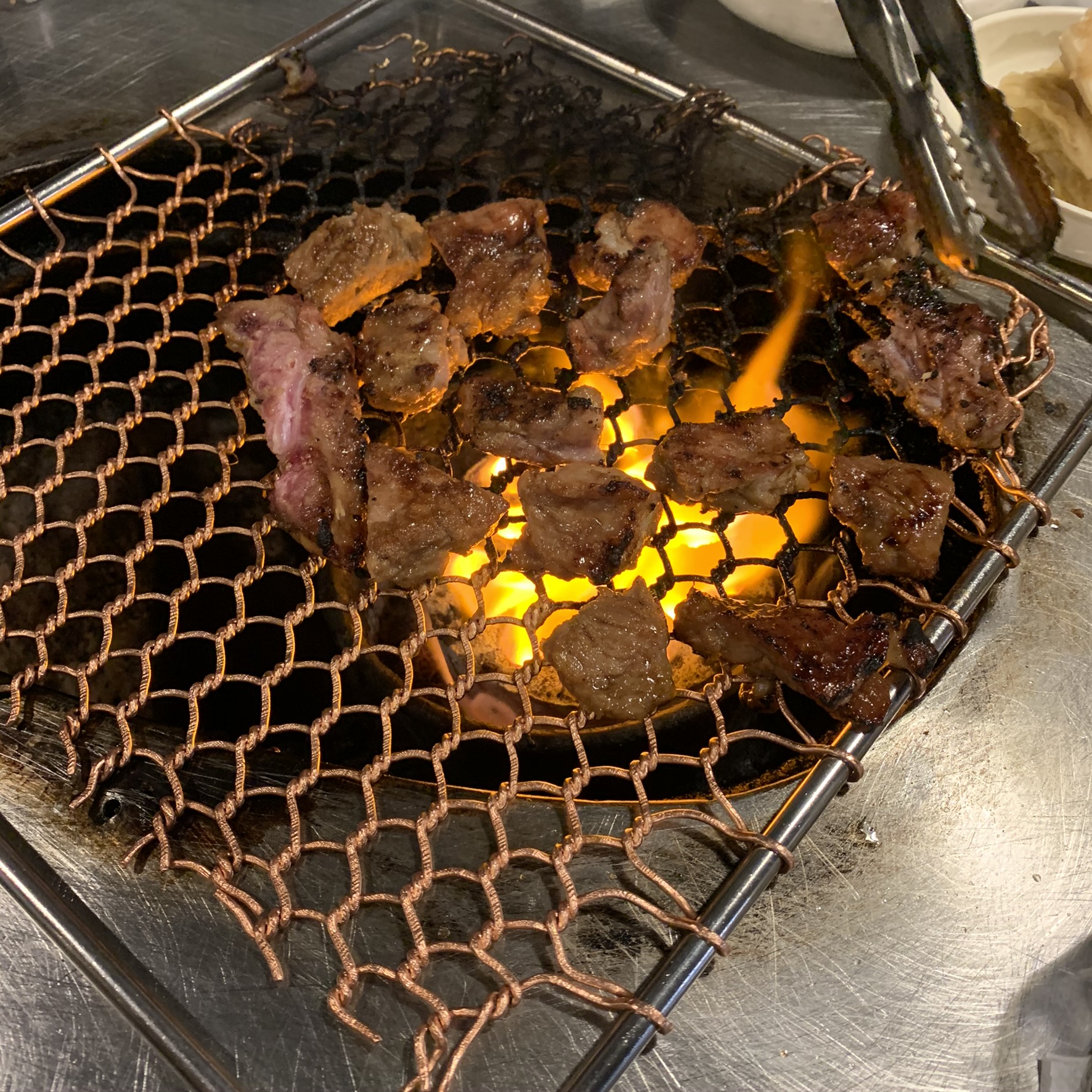 이번엔 돼지갈비입니다. 정말 머금지 하게 생겼죠?ㅎㅎ 이게 1인분 정도 됩니다. 고기도 엄청 두텁하고 양념도 잘 베여있습니다. 윤기도 좔좔 흐르고 품질 좋은 고기를 쓰는 것 같습니다. 저기 아래 보면 연탄 있는 거 보이시죠?ㅎㅎ 연탄 한 덩이 째로 넣어 주시고 그다음에 불판을 올려 줍니다. 양념갈비라 양념이 타기 때문에 자주 뒤집으면서 고기를 구워 주시면 됩니다.