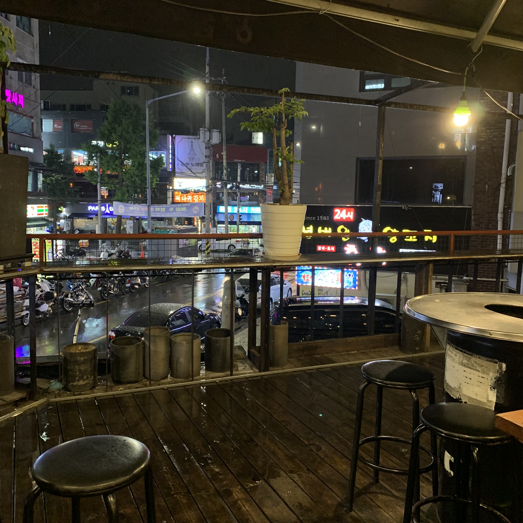 저렇게 간판 앞에 테이블도 있습니다! 비록 오늘은 비가 왔지만 비가 안 오는 날 저녁에 테라스에서 고기 구우면서 소주 한잔하면 정말 좋을 것 같습니다:) 다만 아쉬운 점은 2층에 있다는 점이지만요ㅎㅎ