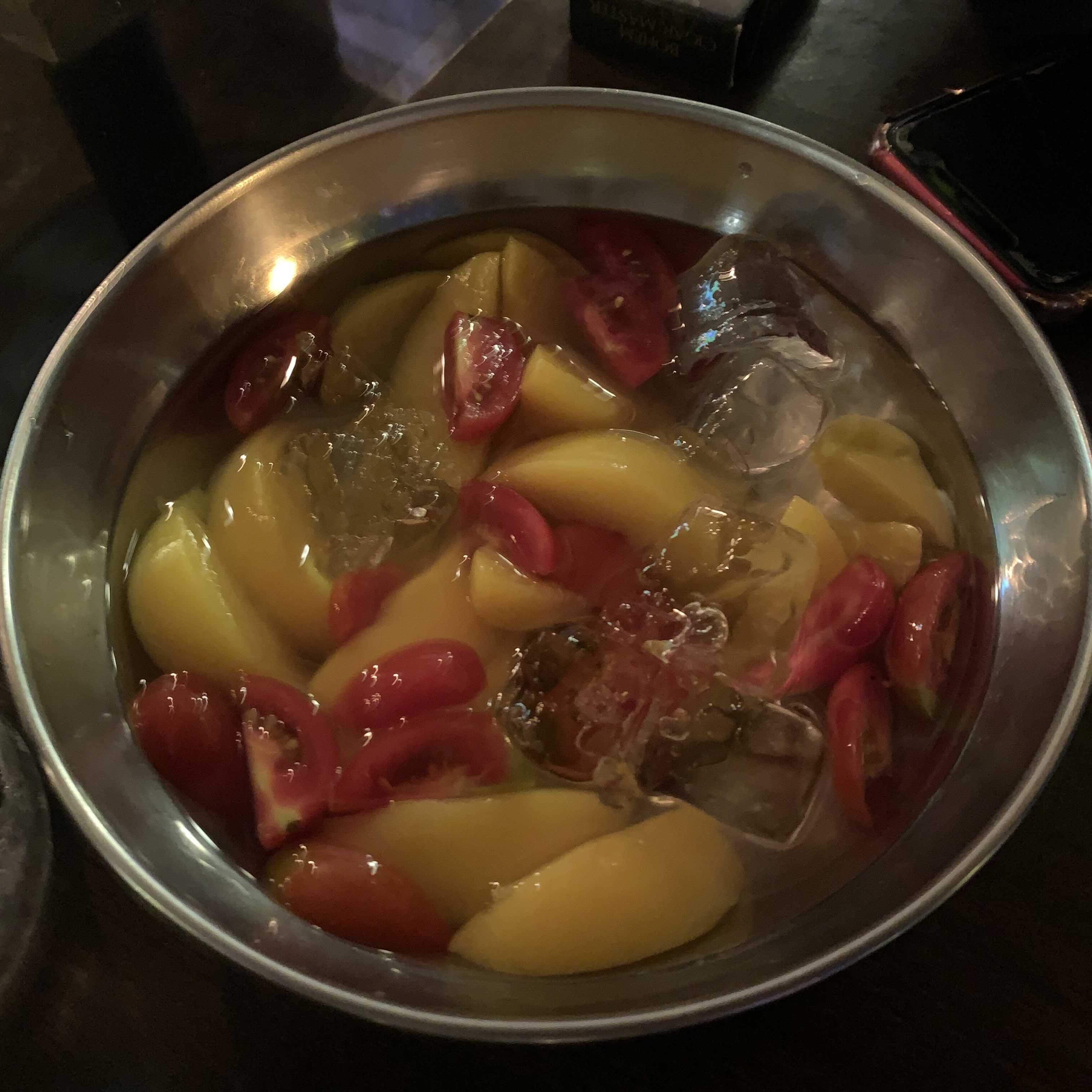 사이드 메뉴의 황도(7,000원) 입니다. 안주가 부족하거나 배가 고플때 저렴하게 먹을 수 있는 아이스 황도 입니다. 방울토마토도 같이 들어가 있어 황도랑 같이 먹으니 이것도 술도둑 이더군요^^..