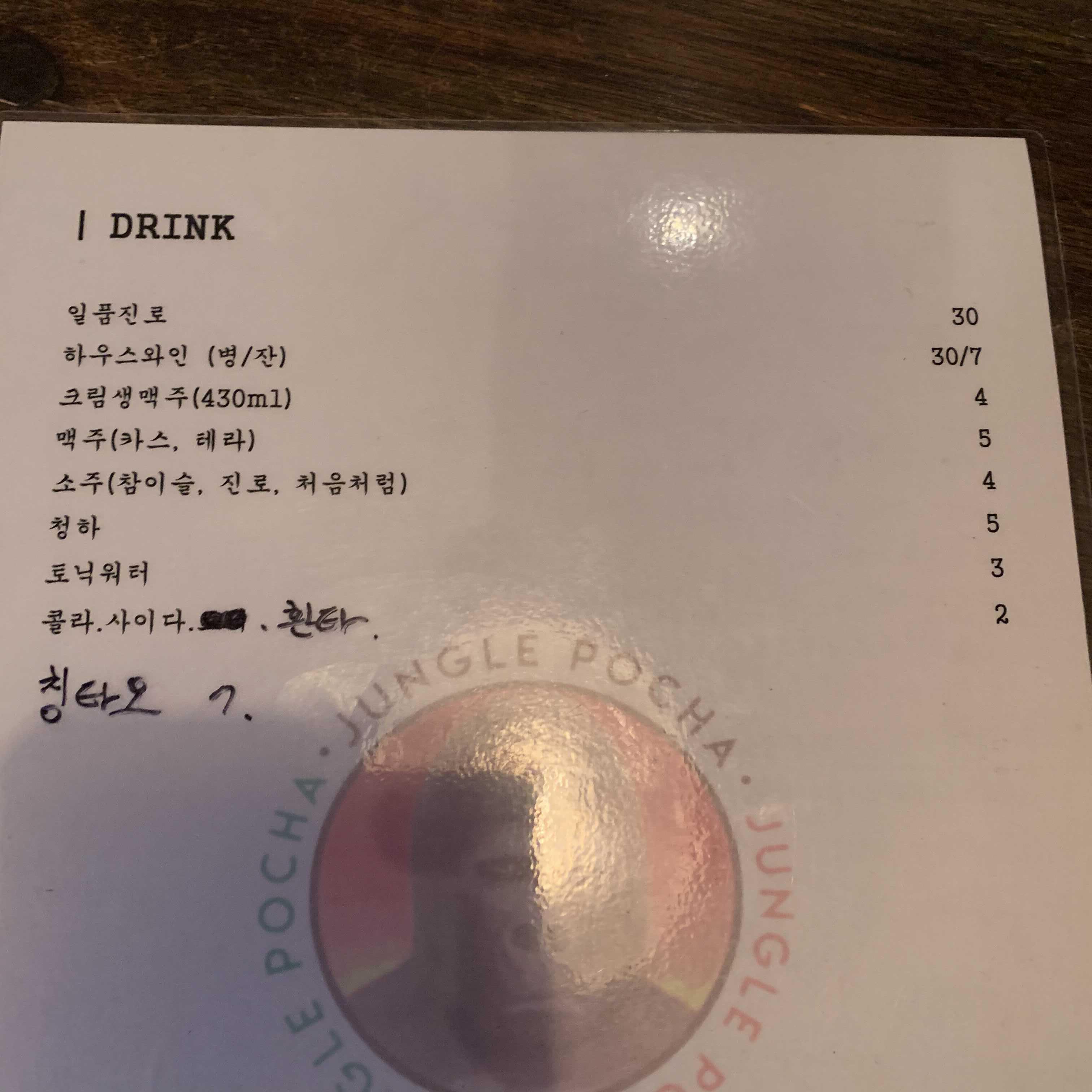 정글포차의 메뉴판 입니다. 앞쪽에는 메인 안주,사이드 안주가 적혀 있고 뒷쪽에 음료가 적혀있습니다. 가격이 엄청 싼편은 아니지만 소주가 4,000원 이라서 비싼것도 아니였습니다. 저는 메인 메뉴의 정글숲(차돌숙주볶음)을 시켰습니다.