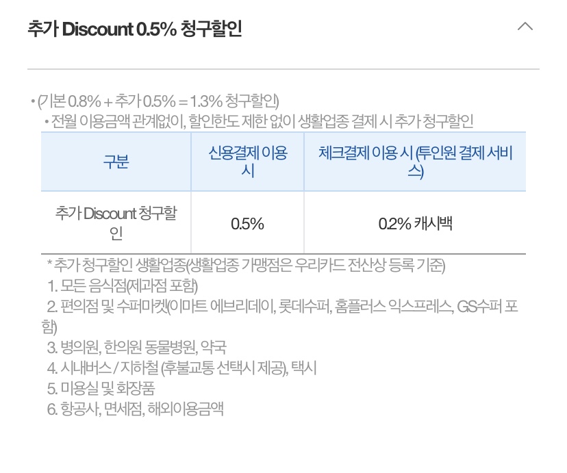 자, 이게 제가 유심히 본 내용입니다 앞의 0.8에서 0.5를 더하면 총 1.3% 할인이 적용됩니다. 단, 모든 가맹점은 아니지만 목록을 보시면 보통 자주 사용 하는 항목들입니다. 기존 사용하던 체크카드는 1.2% 지만 추가 혜택을 보면 1.3%까지 올라가죠??😄 이렇게 저는 체크와 신용 섞어서 쓸 생각입니다 ㅎㅎ