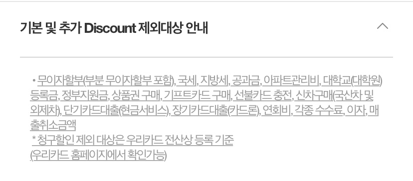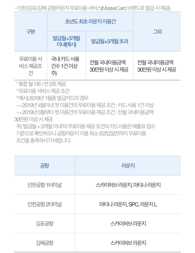 전체적인 혜택을 살펴보면 국내 공항 라운지 무료 이용 말고는 특별한 혜택이 없어요! 하지만 제가 이 카드를 고른 이유는 바로 전월 실적 없이 쓴 만큼 조금씩 청구할인을 해준다는 거죠! 소비를 줄이기엔 딱이죠😀