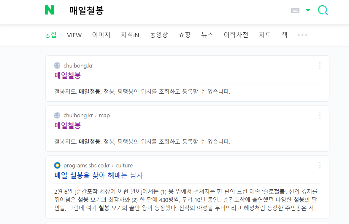 저는 자주 이용하는 포털사이트는 구글이나 네이버인데 매일 철봉이라고 검색하면 이렇게 바로 나온답니다. 저기 바로 맨 위에 나오는 사이트를 클릭해주시면 사이트로 이동됩니다.